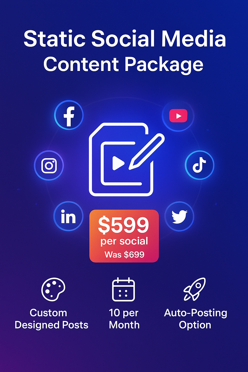 Get professionally designed, single-image content created & posted monthly to your socials – perfect for building a consistent online presence! 💰 Was $699 → Now $399 / per social 📌 Supported Platforms: Facebook Twitter (X) TikTok Instagram YouTube