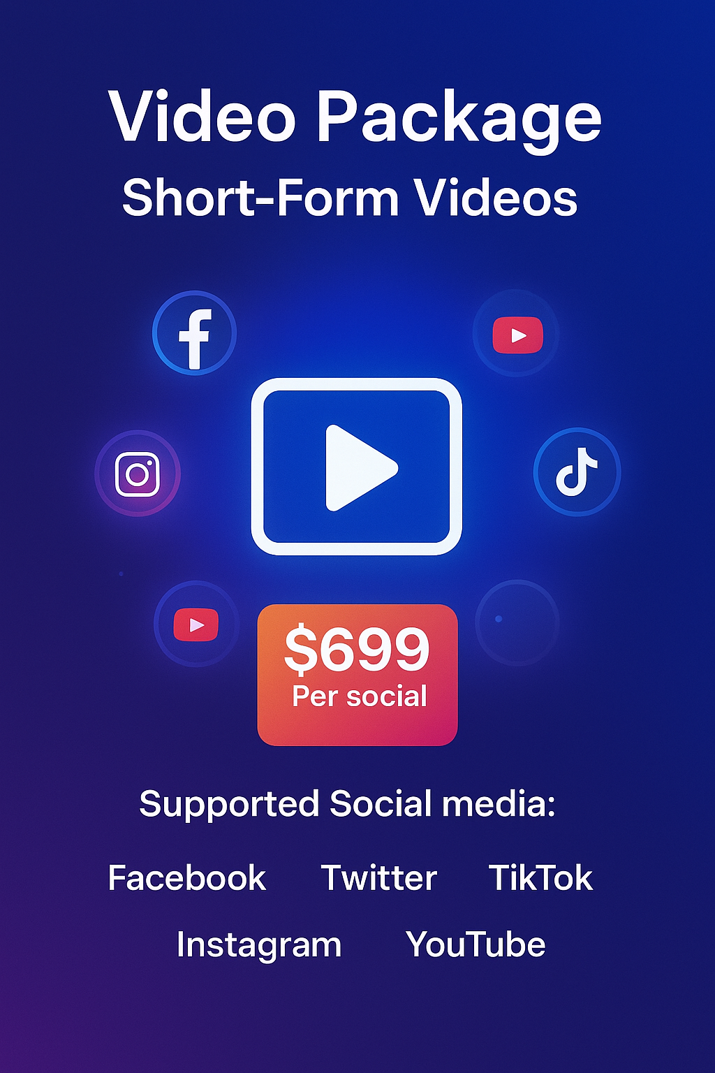 Get professionally made short form videos for your socials, created & posted monthly to your socials – perfect for building a consistent online presence! 💰 Was $799 → Now $699 only / per social 📌 Supported Platforms: Facebook Twitter (X) TikTok Instagram YouTube